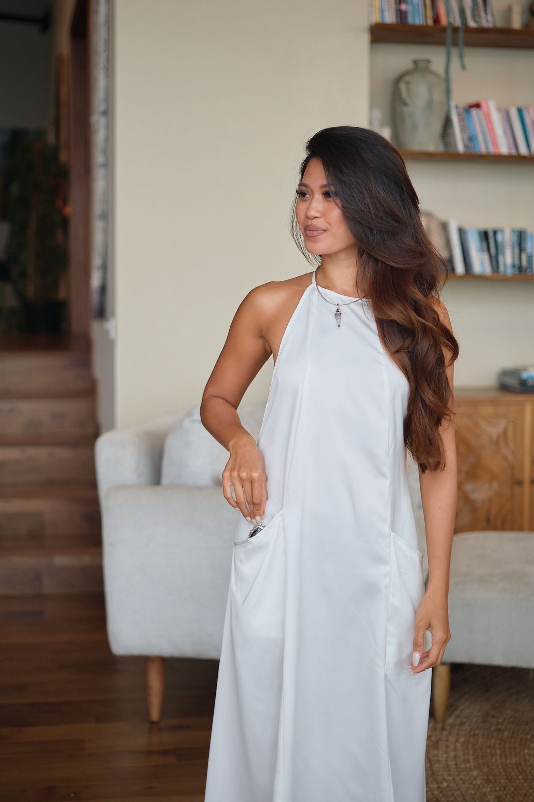 Handcrafted in Bali from flowing Roberto Cavalli silk, this dress moves effortlessly with the body, breathing with every step. The open back reveals a quiet strength and natural elegance, while hidden front pockets bring comfort and practicality — luxury without excess.