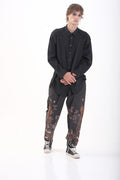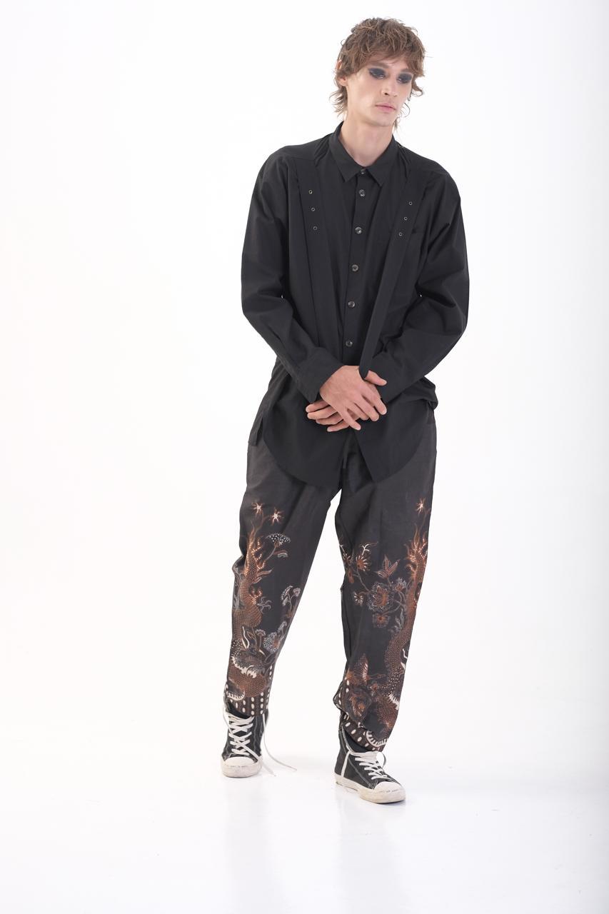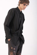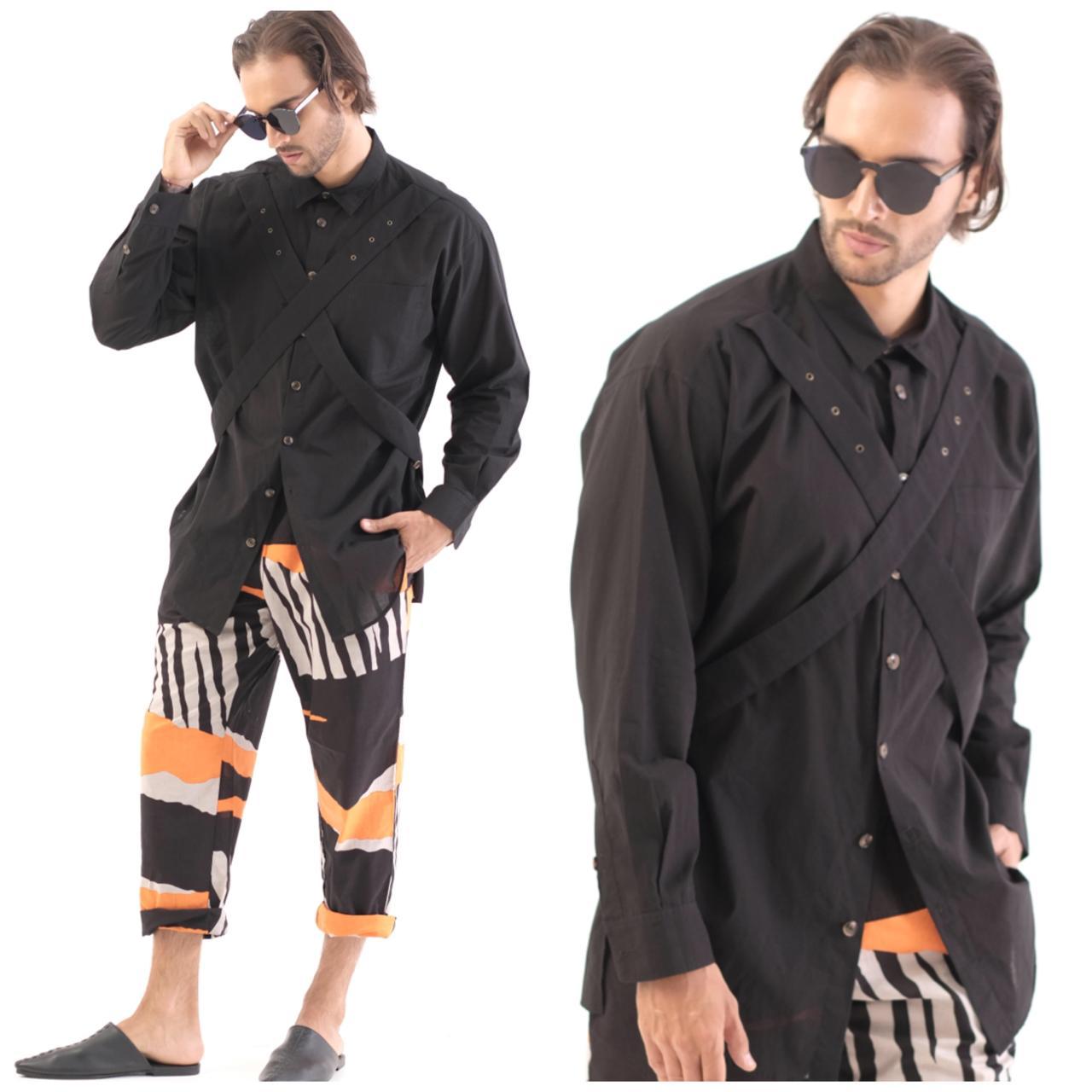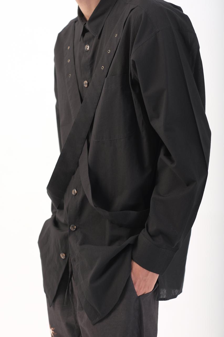 Defined by a diagonal element that cuts across the body, this oversize shirt explores balance, tension, and flow. The silhouette shifts with motion, creating a quiet interaction between structure and freedom.